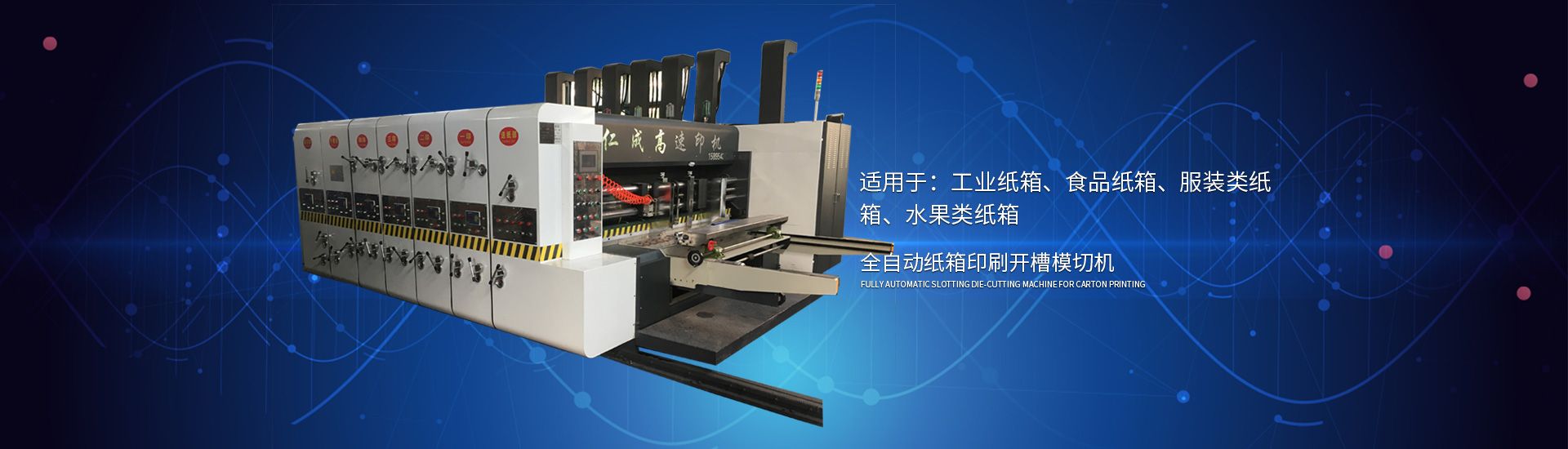 主要產(chǎn)品: 紙箱印刷開槽機, 高速印刷開槽模切機,自動插格機,釘箱機,粘箱機,仁成包裝機械,紙箱機械